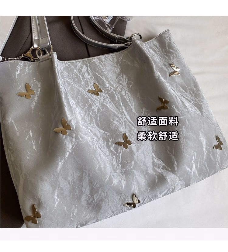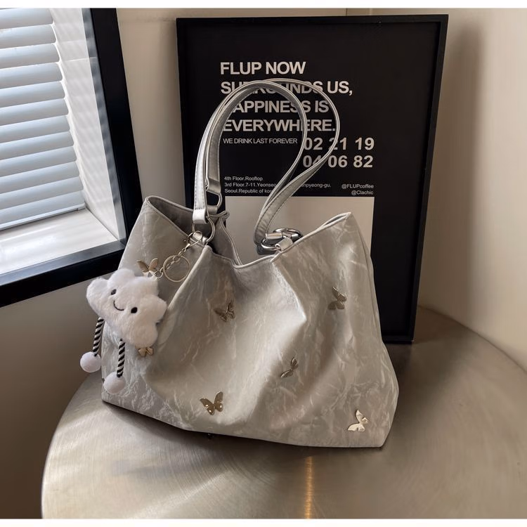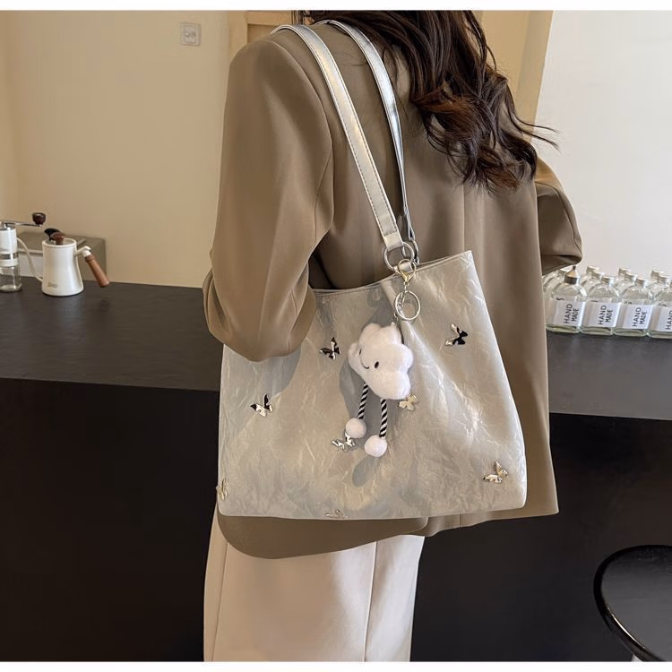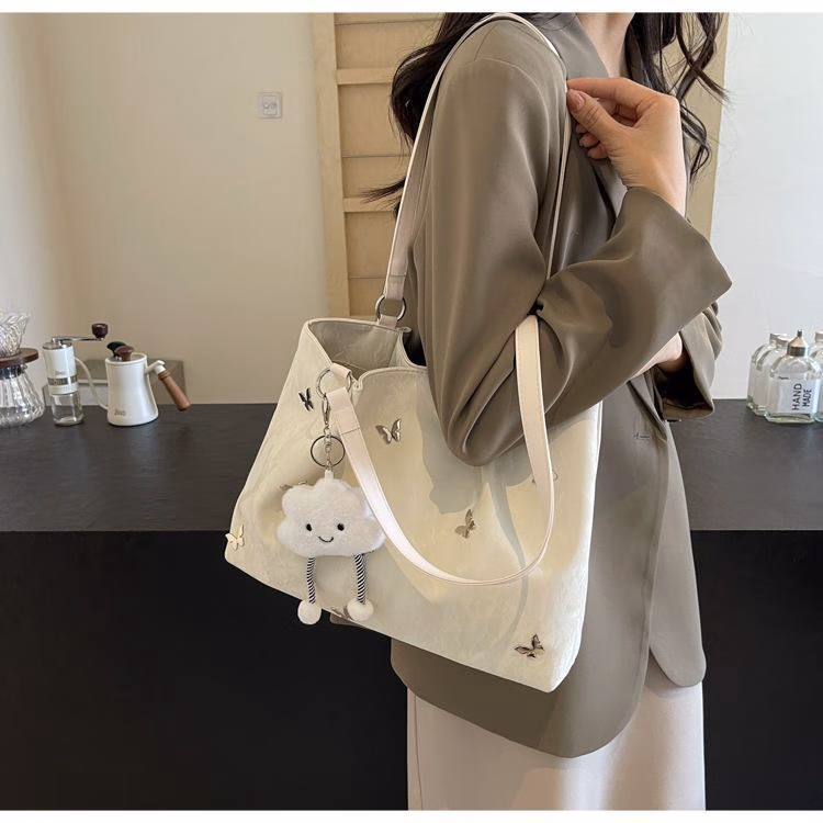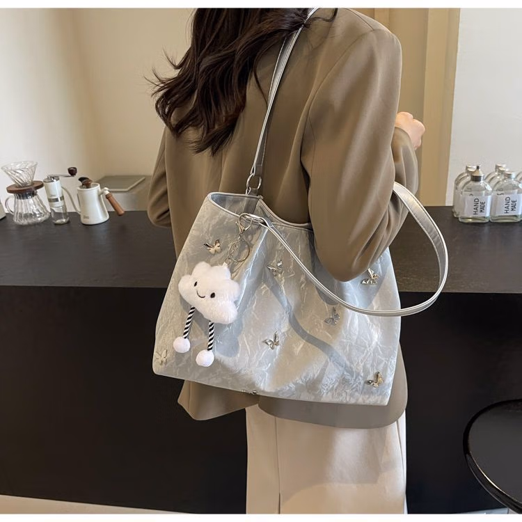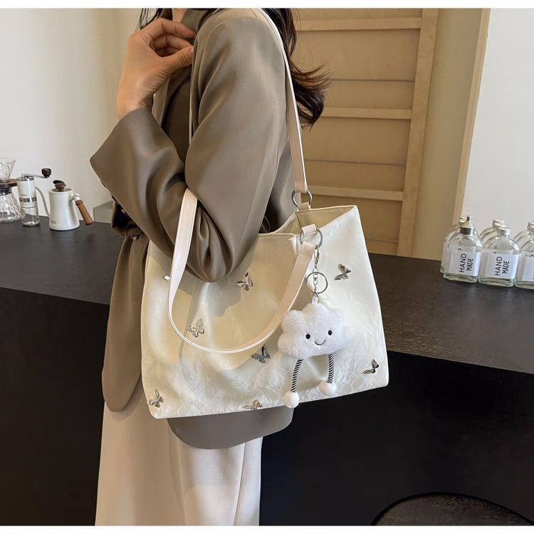 途尊银色托特包女大容量2025新款休闲单肩包今年流行大学生上课通勤包 米白有长腿云朵挂件