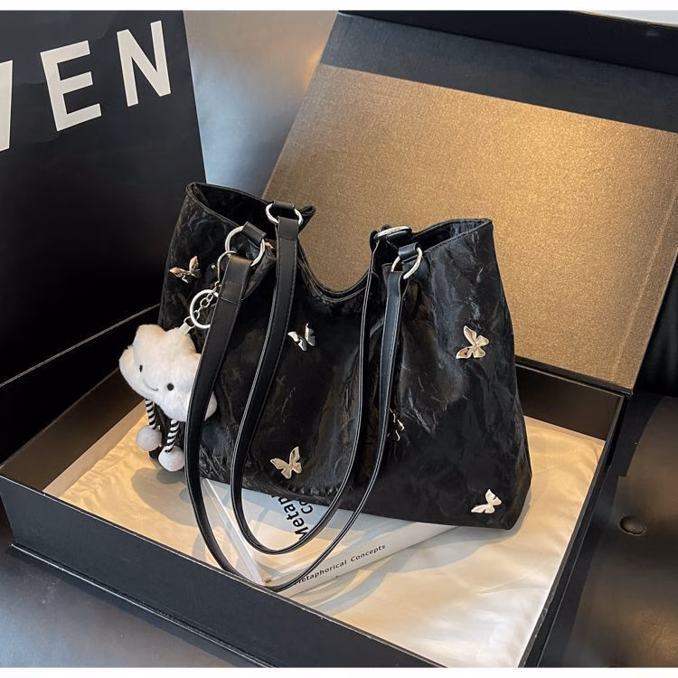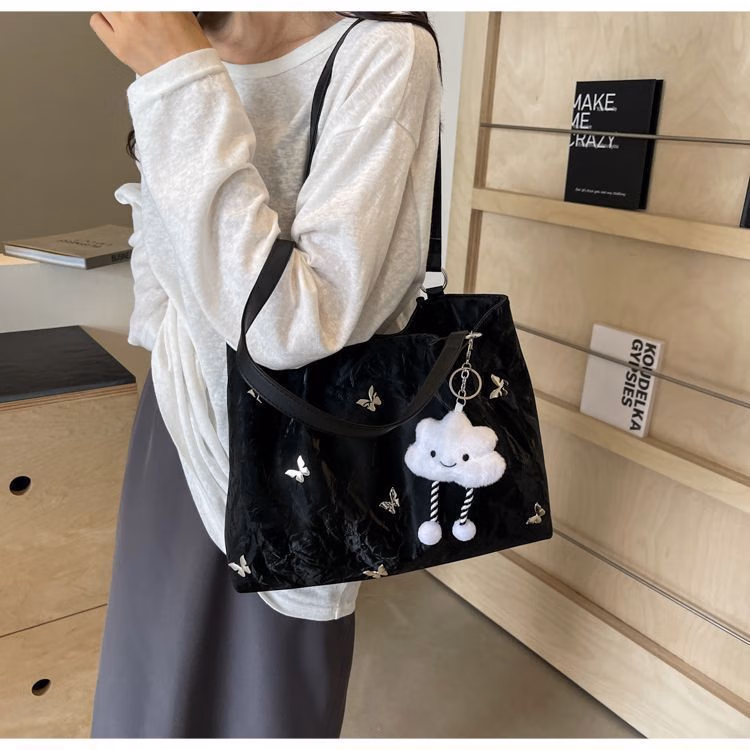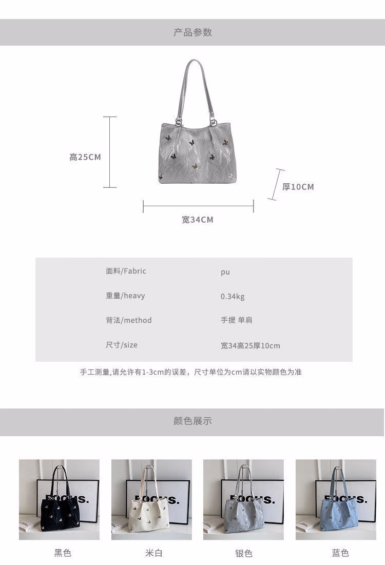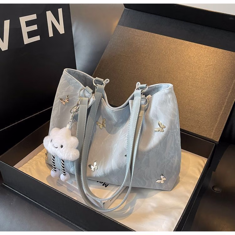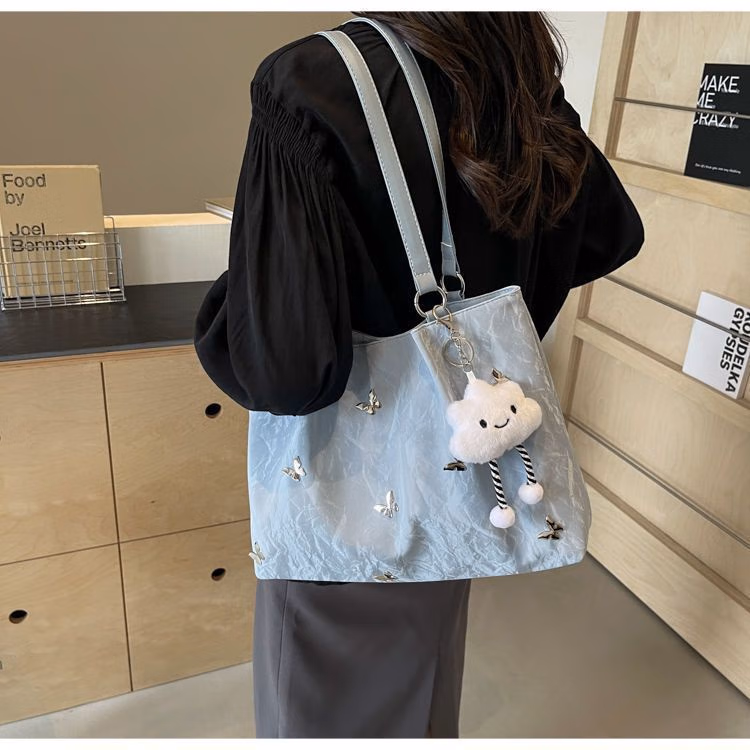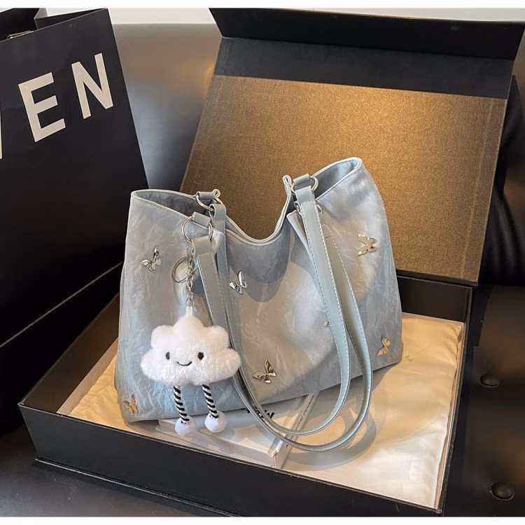 途尊银色托特包女大容量2025新款休闲单肩包今年流行大学生上课通勤包 米白有长腿云朵挂件