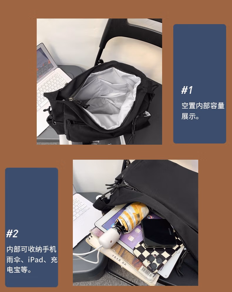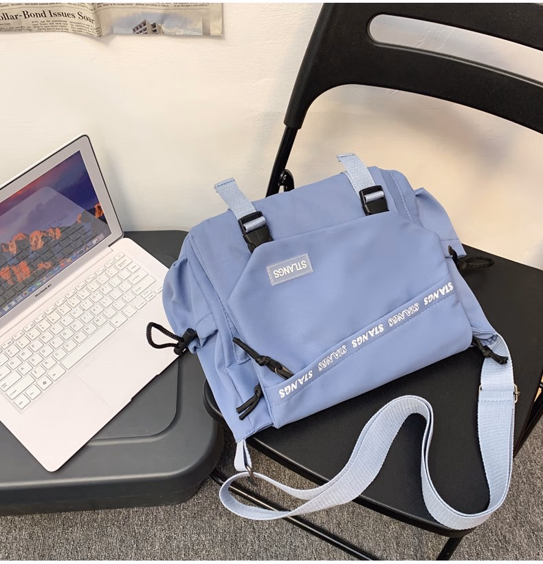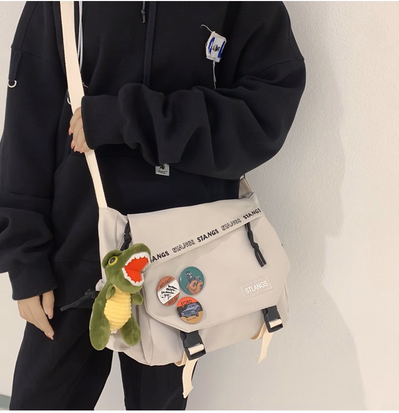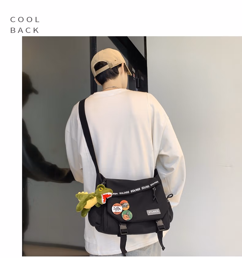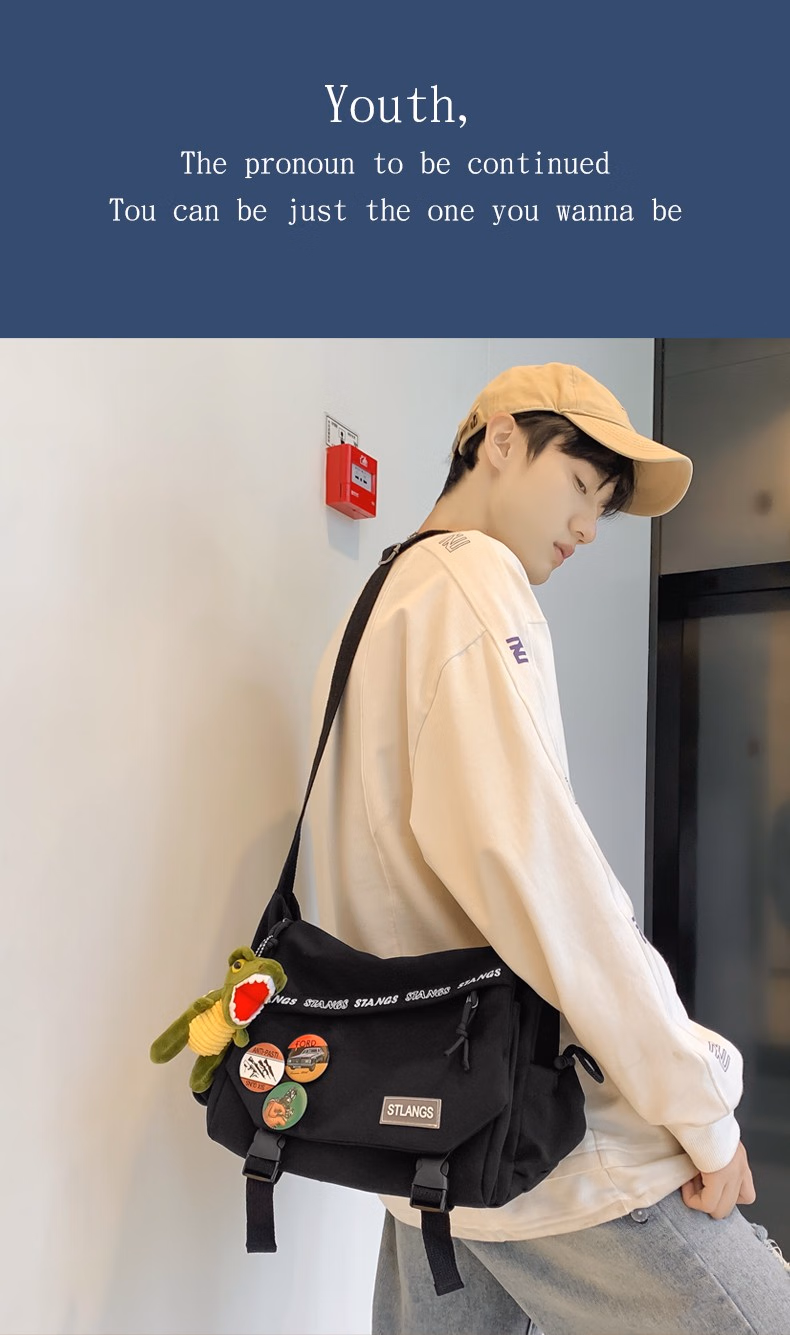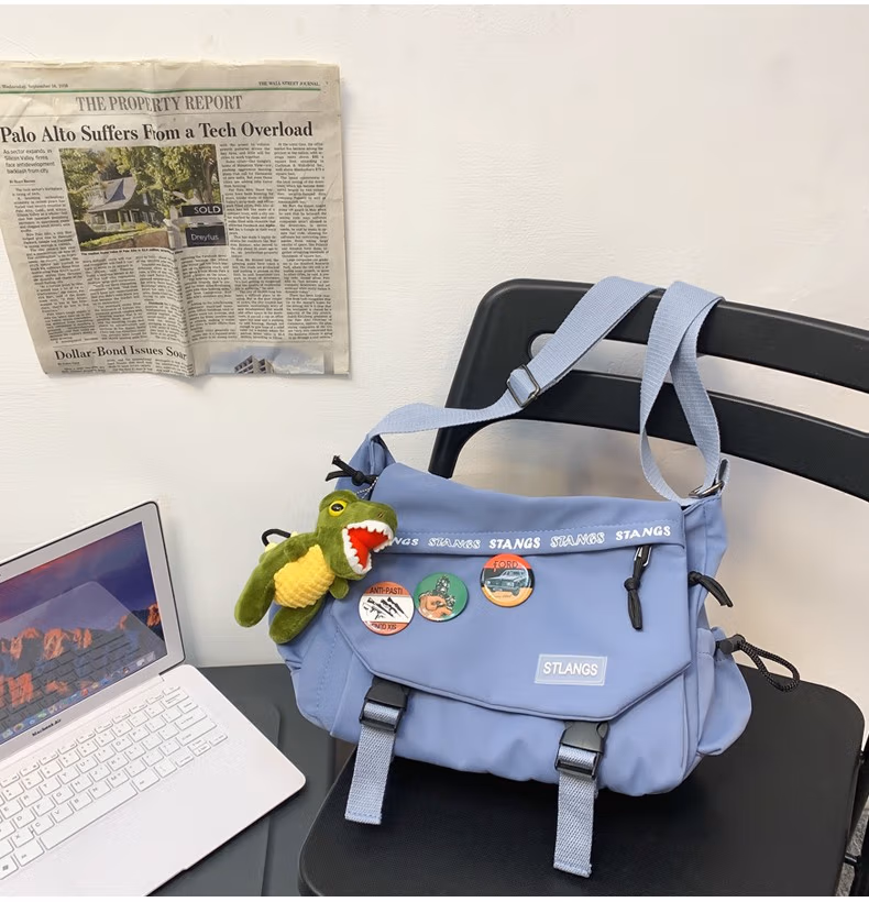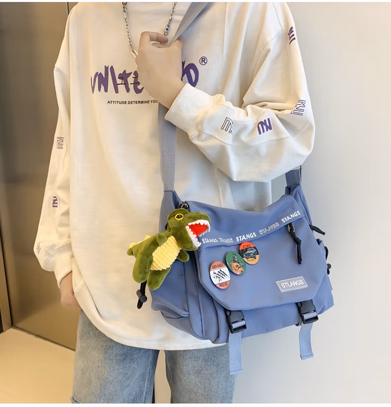 北慕 斜挎包男士潮牌学生休闲百搭潮大容量ins男生背包女邮差包单肩包 蓝色【红嘴恐龙+3个徽章】